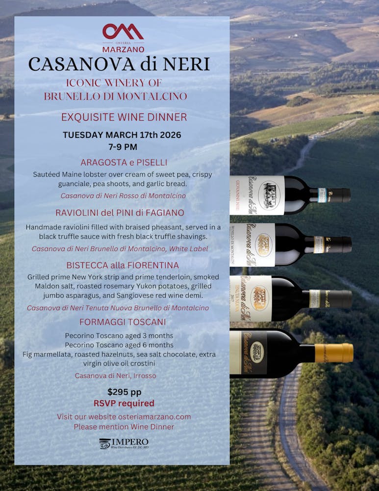 This intimate, four-course dinner has been thoughtfully curated by Chef Marzano to complement a distinguished lineup of wines, including Rosso di Montalcino, Brunello di Montalcino White Label, Tenuta Nuova, and Irrosso.
